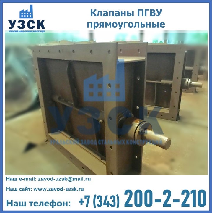 Прямоугольный клапан ПГВУ имеет прямоугольную или квадратную форму, по основному сечению конструкции, на которую устанавливается клапан. Для изготовления шиберов ПГВУ в Обнинске применяются сталь нержавеющая, углеродистая или низколегированная, в зависимости от модели. Внутри клапана имеется запорный элемент, передвигающийся параллельно общему потоку движения среды. Запорный элемент, или створка имеет такую же форму, как и основное сечение. Перемещение створки происходит благодаря возвратно-поступательным движениям.