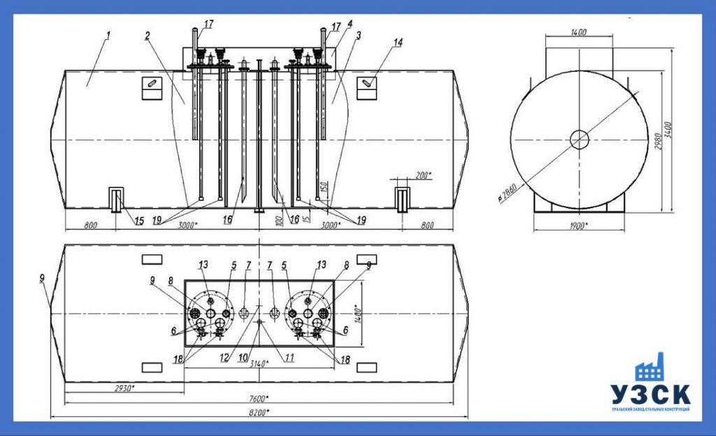 Все горизонтальные резервуары сходны по конструкции. Это цилиндрическая емкость, имеющая торцевые днища. Если днище плоское, емкость эксплуатируется при внутреннем давлении меньше 0,04 МПа (кгс/см2). Сферическое или конусное днище, позволяет поднимать рабочее давление до 0,06 МПа.